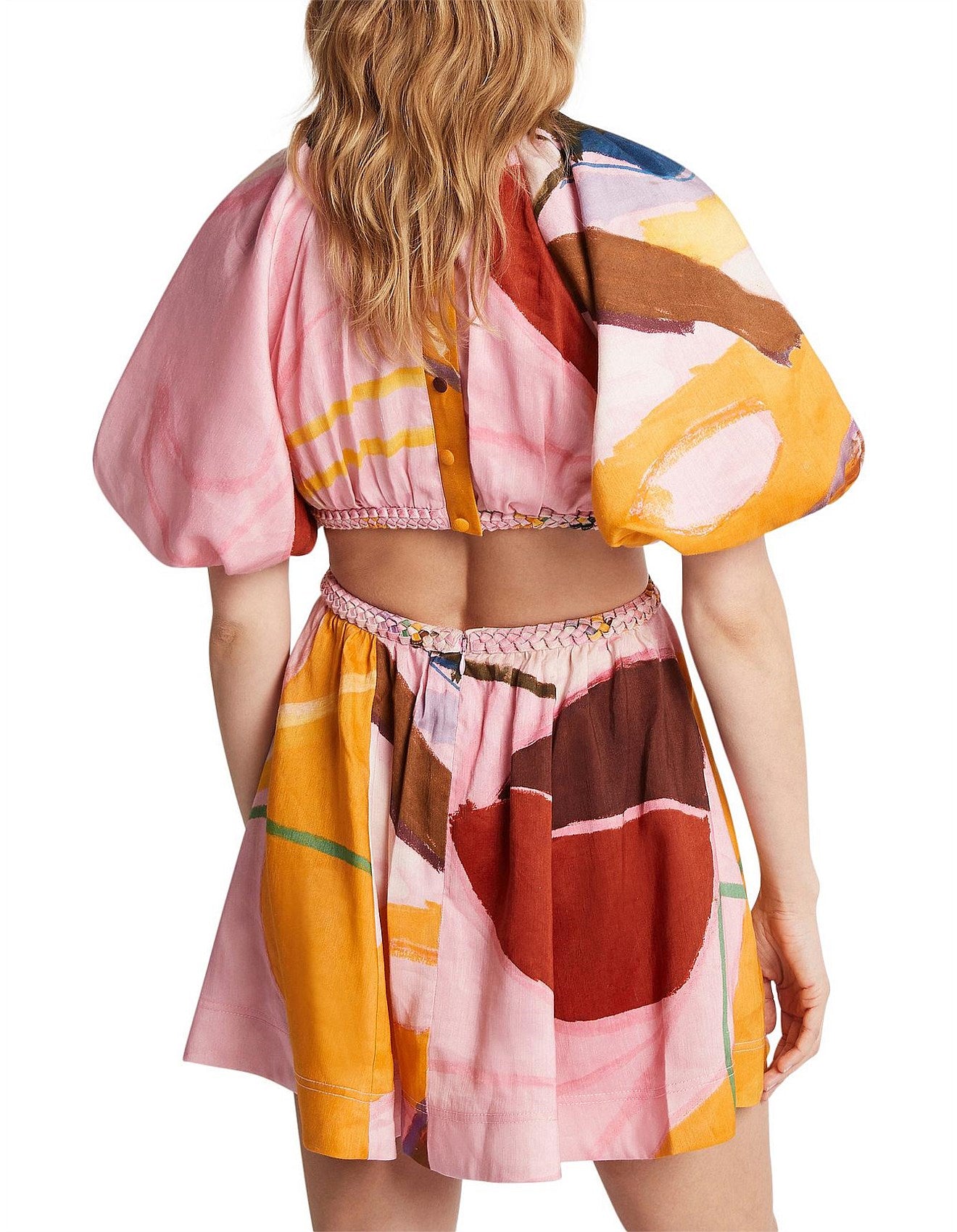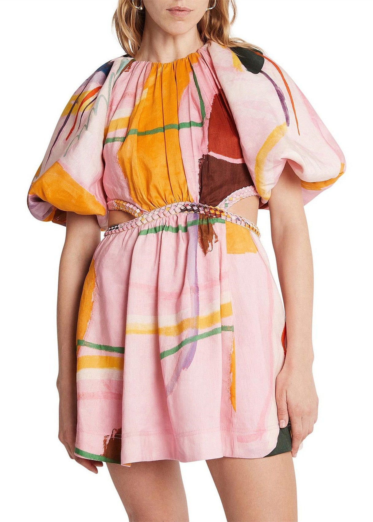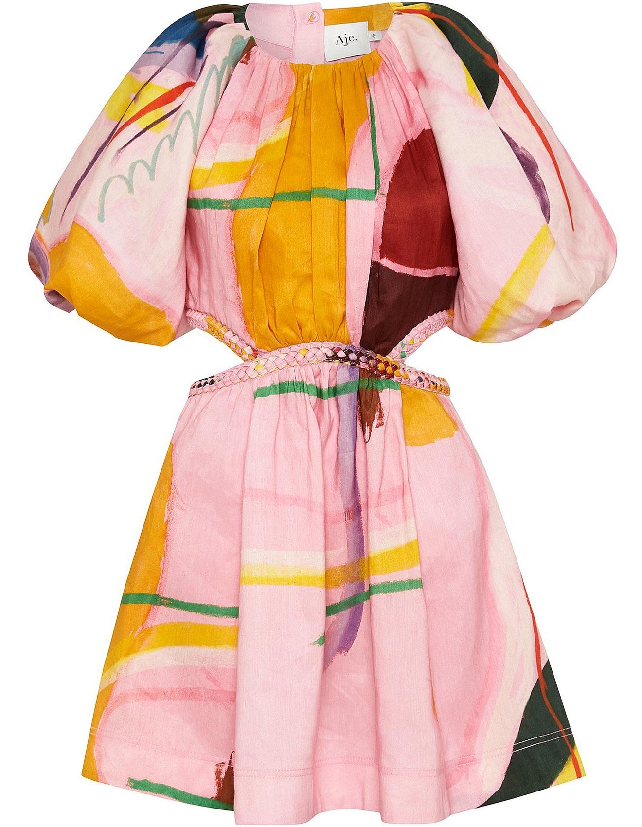 The Aje Capucine Puff Sleeve Mini Dress is a chic and modern piece, combining bold design elements with refined details. The fitted bodice features a stylish waist cut-out, accentuated by braided edging for a unique touch. Short puff sleeves add a playful, feminine vibe, while the gathered mini skirt with side seam pockets enhances both comfort and functionality. The dress is finished with a zip and snap button closure at the centre back bodice, along with an invisible zip closure at the back skirt, ensuring a smooth and secure fit.