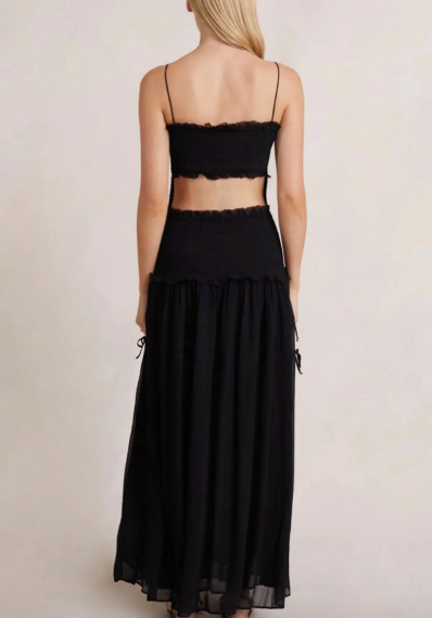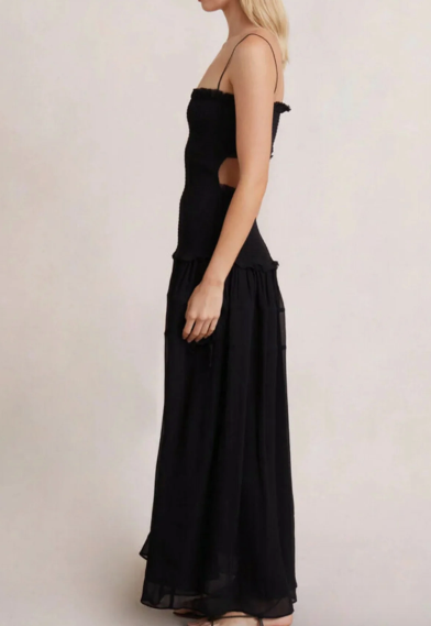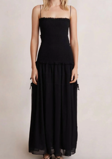 The Bec & Bridge Charlotte Dress is expertly crafted from lightweight viscose fabric, boasting a shirred bodice, ruffles, thin rouleau straps, and a back cut out. The dropped waist adds a touch of elegance, leading to a flowing gathered skirt with stylish side self-ties.