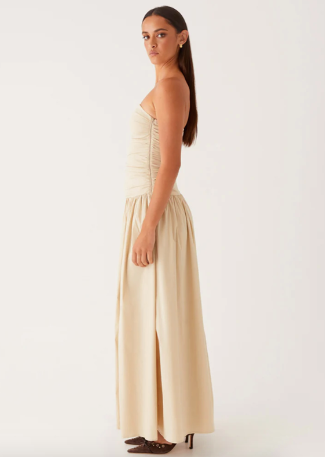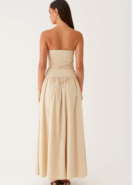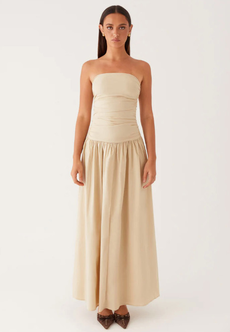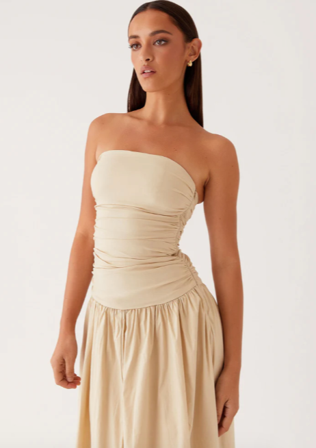 Introducing the Carmel Maxi Dress. With its strapless neckline and ruched bodice detailing, this dress exudes sophistication and charm, perfect for making a statement under the moonlit sky.