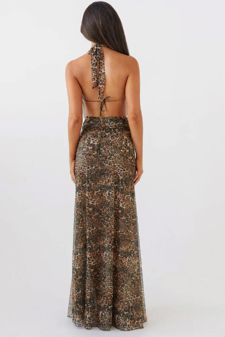 Introducing our best-selling Elysia Mesh Maxi Dress. Crafted from mesh fabric in an leopard print, this dress features a low cowl neckline and an open back. Perfectly designed for embracing golden skies and balmy nights.