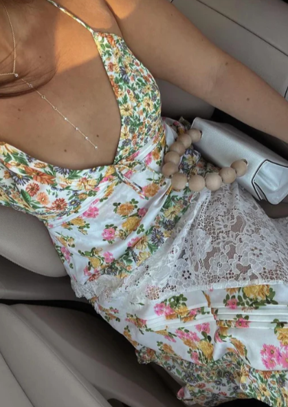 Dreamy asymmetrical patchwork garden and carnation print maxi dress featuring a plunging neckline, fresh white floral lace paneling, and feminine pintucked and ruffle detailing throughout. Partially lined, delicate shoulder ties.