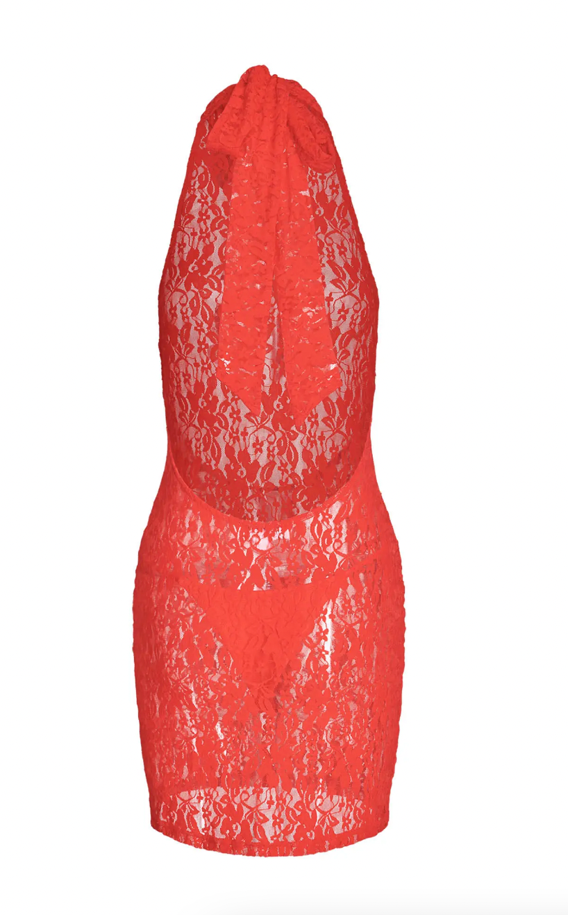 The best-selling Cruzi Dress is now available in a stunning new Red Lace colorway, bringing an alluring twist to its signature style. This mini-length, bodycon dress hugs every curve with its fitted silhouette, while the high neckline and halter neck tie add an element of sophistication. The low, plunging exposed back reveals just the right amount of skin designed to be sheer and unlined, it’s recommended to wear it without a bra or pasties for the most seamless look.