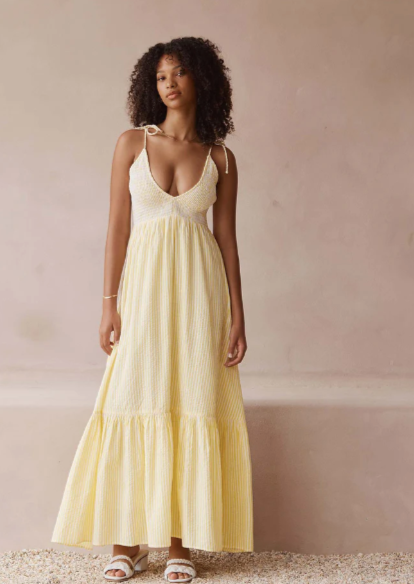 Ready for summer garden parties and long days by the sea the Layla maxi dress hugs you in all of the right places and flows freely to the ground creating a casual yet dramatic feel. Cut from 100% cotton with delicate yarn-dyed lemon yellow and white stripes, complete with shirred bust and adjustable tie straps the Layla maxi is your go-to for catching the suns rays.