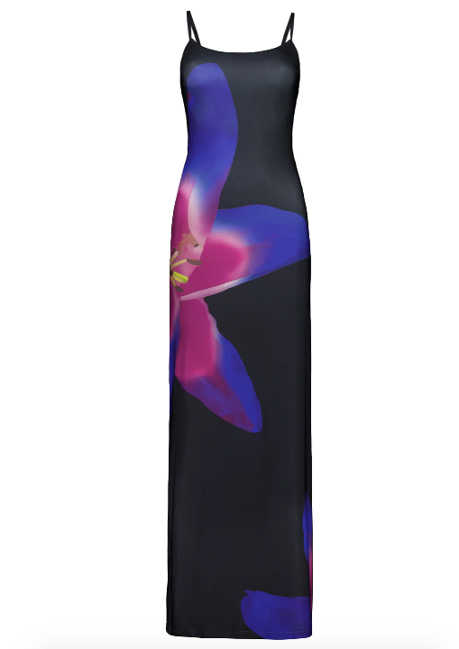 Our new Midnight Lily Floral Slip Dress evokes femininity and glamour in our softly toned pink hues print. This in-house originally designed Slip Dress features our signature figure-hugging maxi with adjustable straps, a round neckline, and a rear split.