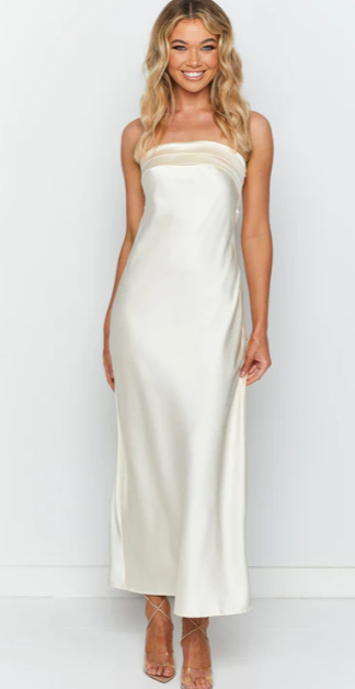 Slip on this stunning maxi dress with gold accessories and heels for your next classy occasion whether its drinks with the girls or an upcoming event - with the satin like material and unique style you're bound to make an impression!
