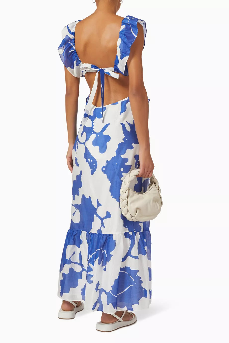 The Vivi Frill Maxi Dress is a stunning and feminine piece, designed with delicate details to enhance your silhouette. Crafted from a luxurious blend of lightweight silk and cotton, this midi dress showcases SIR.'s exclusive Merce abstract print, making it a unique and eye-catching addition to your wardrobe. The ruffle plunge neckline, front cut-outs through the waist, and open-back detail create an elegant yet bold statement.