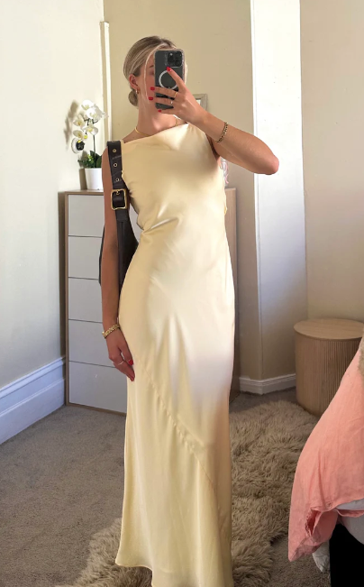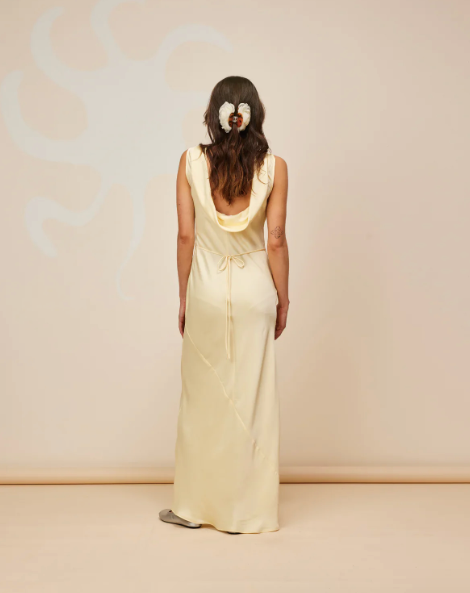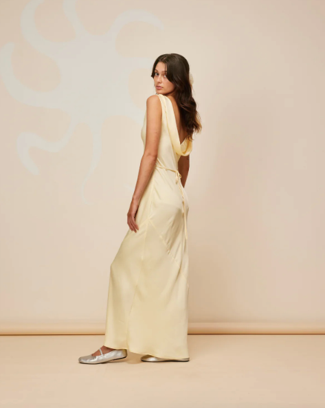 A graceful sleeveless midi dress in luxurious butter-yellow satin, designed for effortless elegance. The minimal silhouette is elevated by a sophisticated cowl back and a built-in tie to cinch the waist, creating a flattering shape. Fully lined for a seamless fit, this timeless piece offers both comfort and refined style.