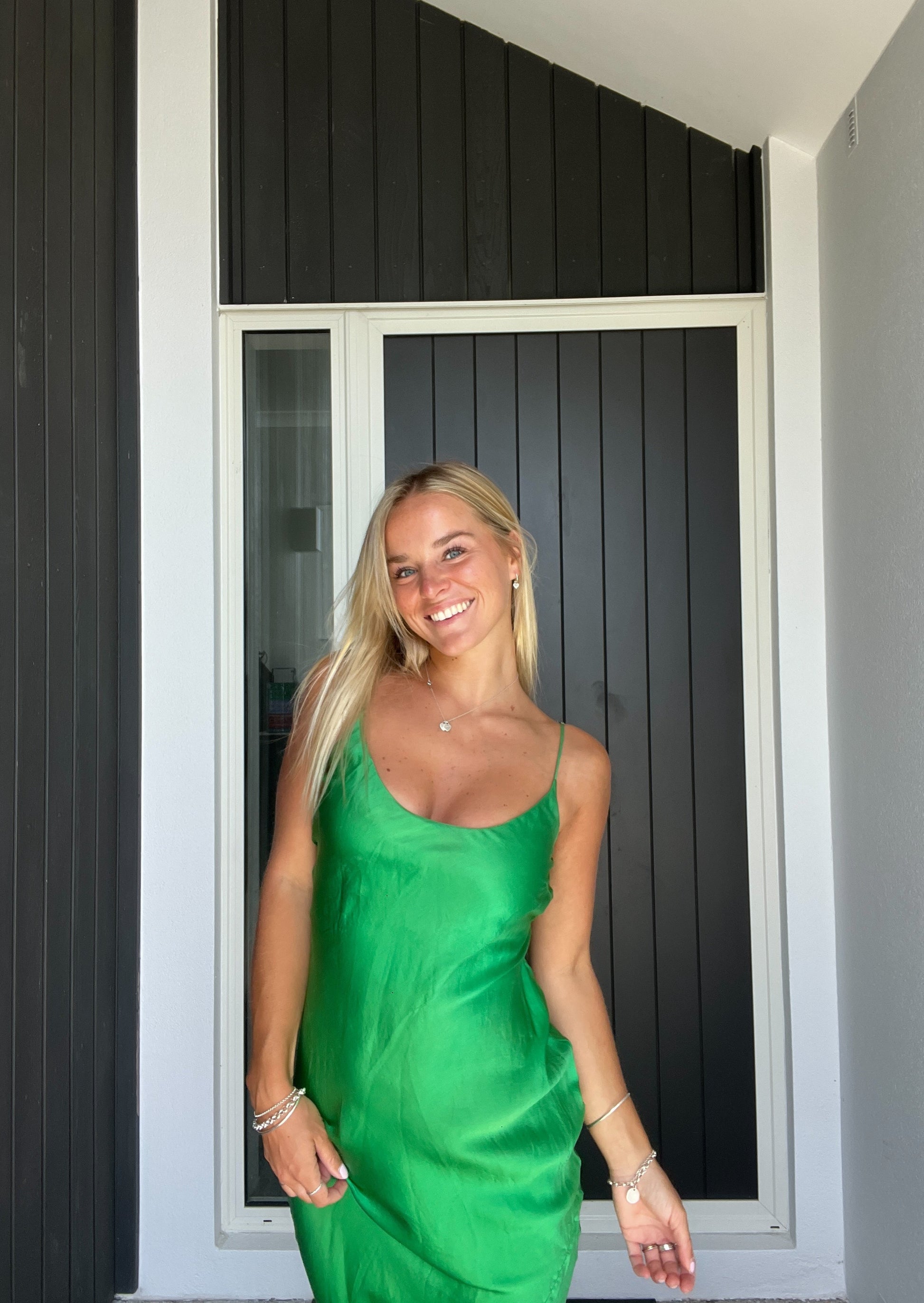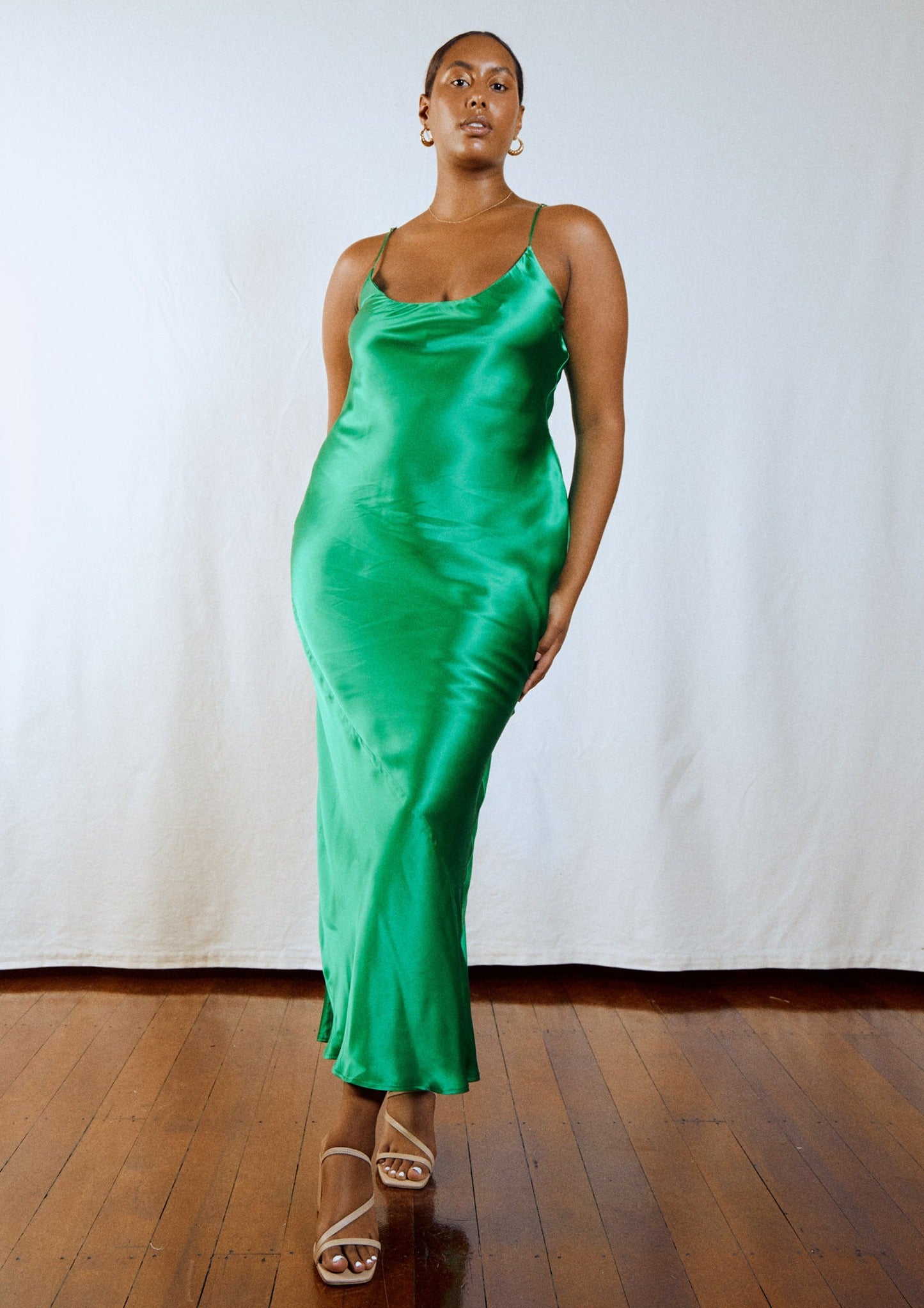 The Logan Silk Slip is a bias cut maxi dress. It has a form-fitting shape with a floaty skirt and adjustable spaghetti straps.