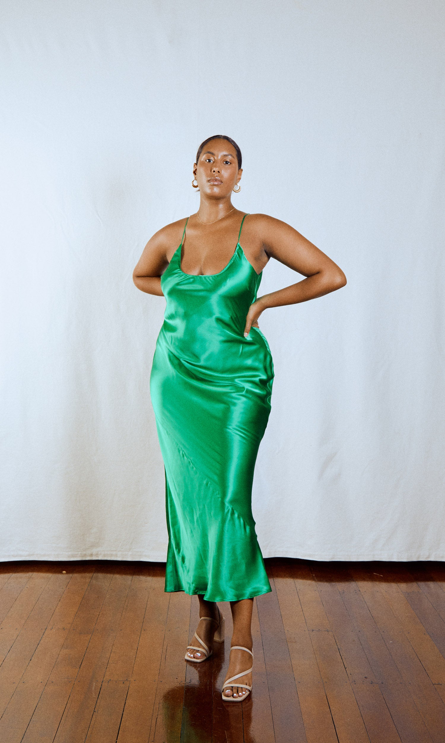 Bias cut maxi dress, Form fitting shape with floaty skirt, Adjustable spaghetti straps, Made in Auckland, New Zealand