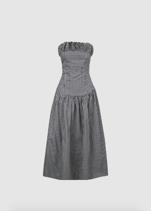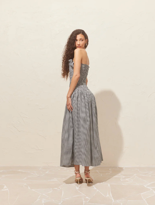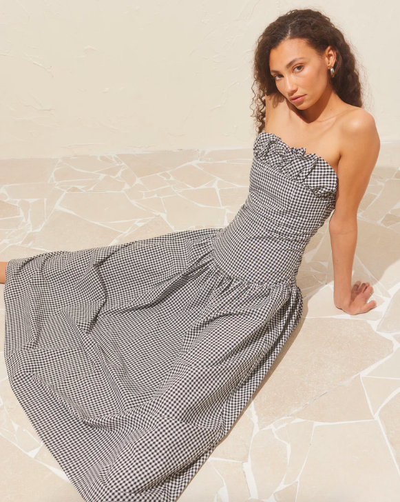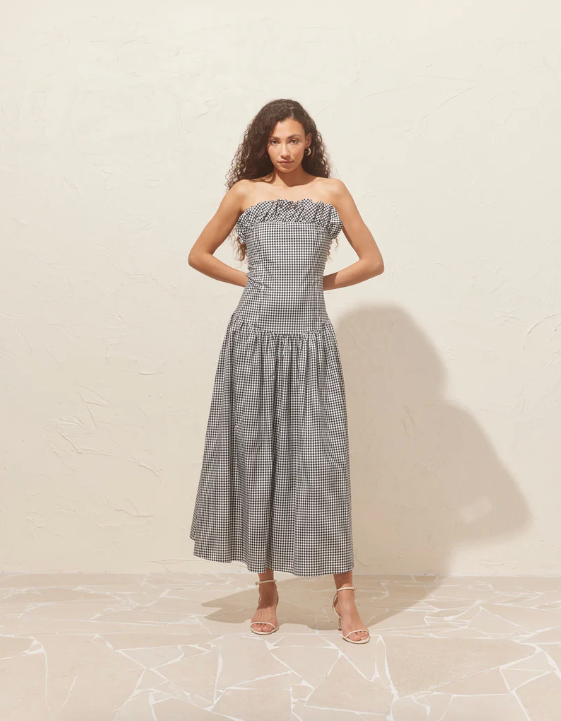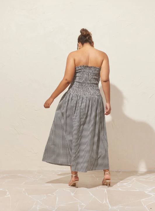 The Ruby Sorbet Maxi Dress is a stylish strapless cotton design, highlighted by a bold ruffled puff detail at the bust. Featuring a dropped bodice-style waistline that flows into a dramatic full skirt, it combines elegance with playful charm. The elasticated shirred back ensures a comfortable, secure fit, making it perfect for standout summer moments.