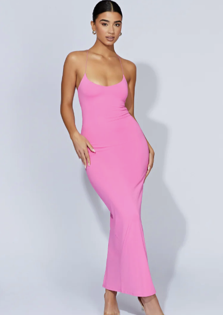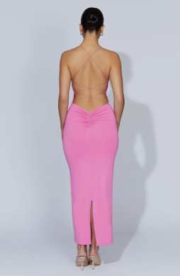 Sabine's dress, made of soft-thin spaghetti straps and ruched fabric, exudes a modern, goddess-like quality. Designed to hug and enhance your curves, the delicate material creates clean lines and smooth edges. The intricate detailing on the back, including the thin, crisscrossed straps and intense center ruching, is a work of art. Not only does the dress cinch your waist, but it also highlights your booty in the most flattering way possible. The maxi dress length provides a modest front while the daring open back adds a touch of flair. As the saying goes, it's "business up front, party in the back!"