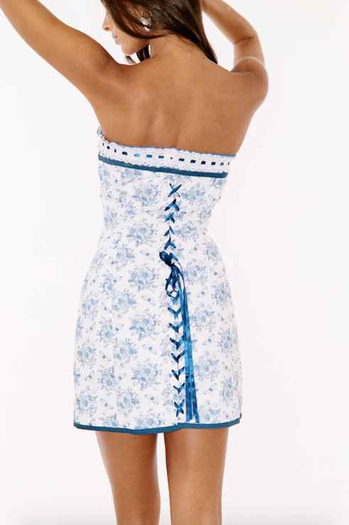 The Sabrin Dress is a strapless corset style dress with a hook and eye front closure featuring a lace detail bust and lace up ribbon back.