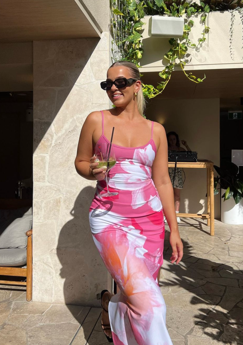 Our new Valentina Slip Dress evokes femininity and glamour in our softly toned pink hues print. This in-house originally designed Slip Dress features our signature figure-hugging maxi with adjustable straps, a round neckline, and a rear split.